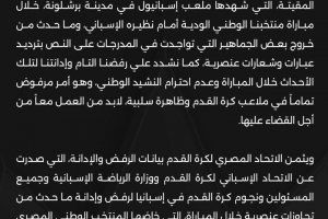 埃及足协高度赞赏西班牙足球协会、西班牙体育部、所有相关官员以及西班牙足坛明星们所发表的声明,他们对比赛中发生的种族主义行为表示了明确的拒绝和谴责,埃及国家队在赛场上凭借顽强的斗志和高超的技术奋力拼搏,展现了足以与主队抗衡的实力,为世界杯决赛圈的比赛做好了充分准备。